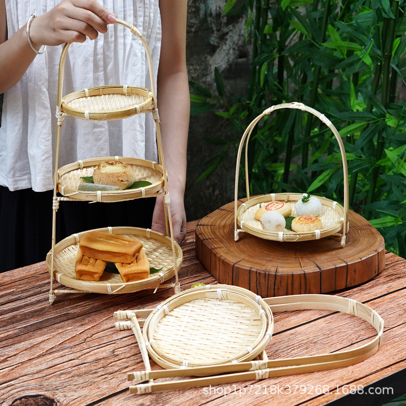 竹编簸箕竹篮子点心托果盘圆形提手多层小竹篮果篮带木架子小道具
