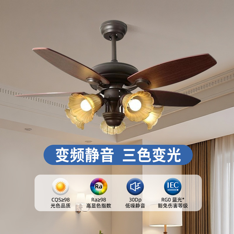 跨境美式餐厅客厅风扇灯一体吊扇灯卧室玻璃复古花纹中山灯具