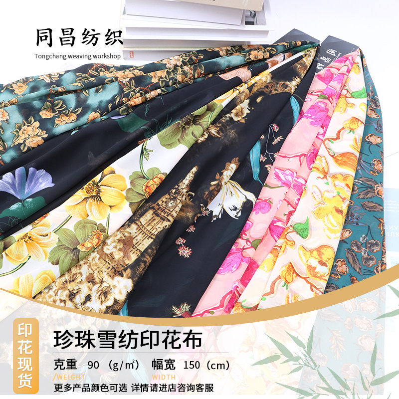 夏季粉色荷花印花粉色雪纺织物 窗帘服装珍珠雪纺面料 涤纶印花面