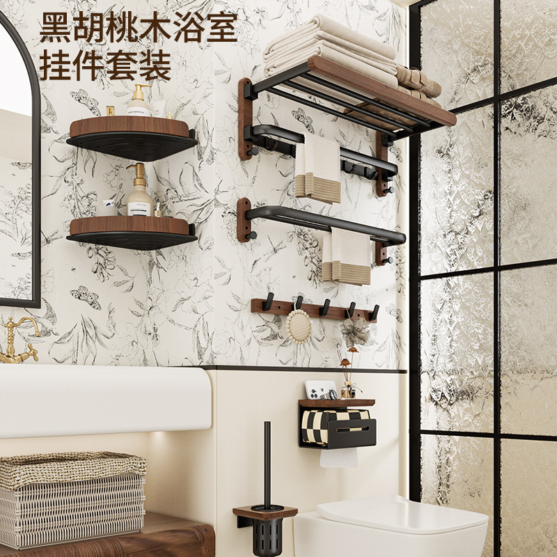 免打孔太空铝原木壁挂收纳架高端卫生间挂件套装胡桃木浴室置物架