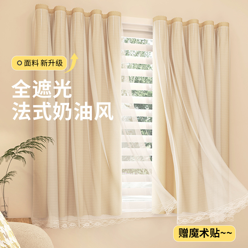 免打孔粘贴带纱双层高遮光窗帘 简易纯色遮阳布北欧风卧室 包邮