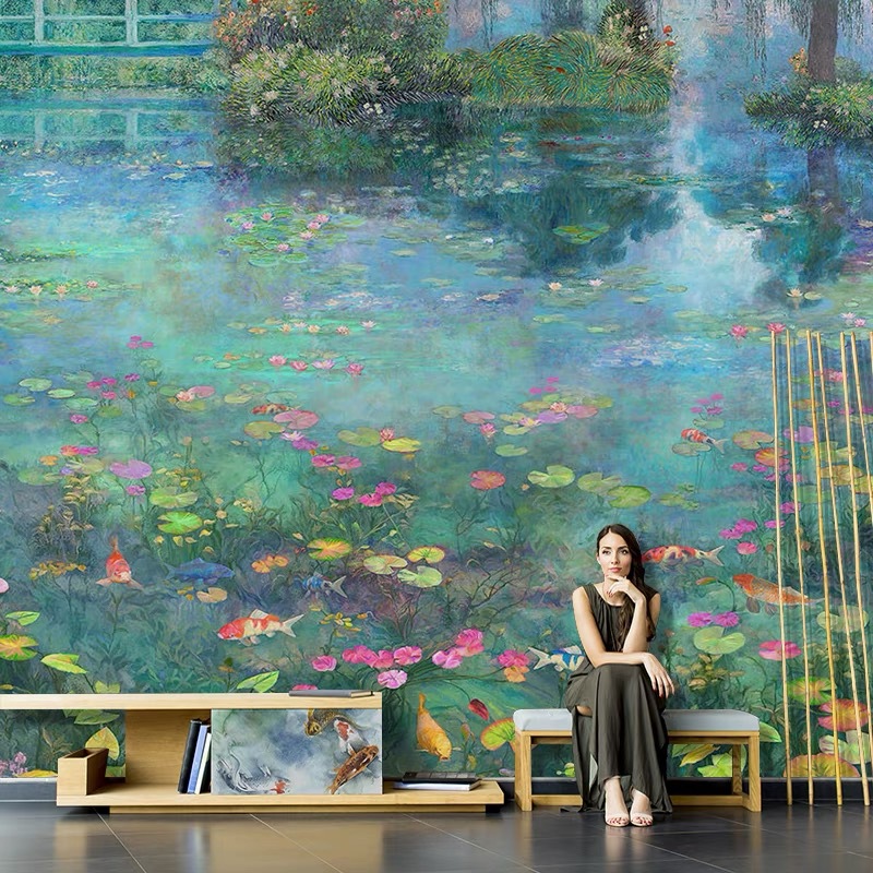 北欧手绘油画田园壁纸莫奈睡莲风景壁画客厅电视背景墙纸无缝墙布