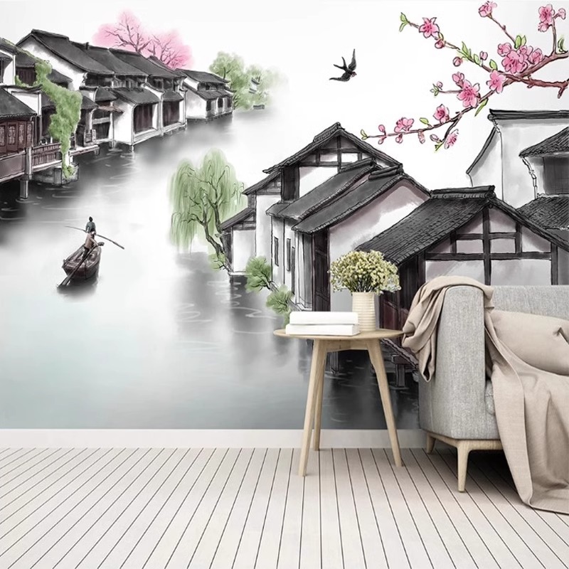 手绘古风新中式江南水乡壁纸微派水墨山水画餐厅饭店酒楼墙纸壁画
