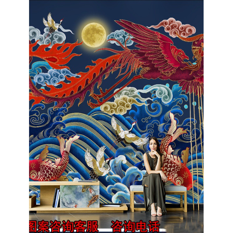 3d手绘抽象覆古艺术敦煌飞天凤凰壁纸电视背景墙纸纹身店壁画墙布