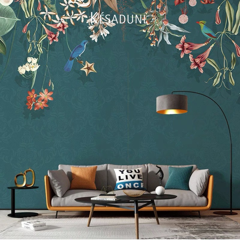 美式轻奢复古墙纸卧室床头背景墙壁纸手绘墨绿色孔雀绿色壁画墙布