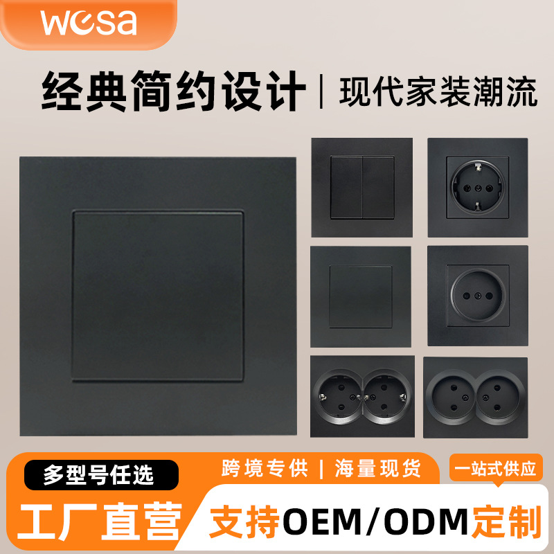 跨境欧标接地插座家用10A开关外贸一开墙体开关黑色暗装墙面插座