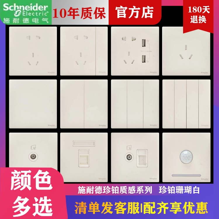 施耐德珍铂质感系列开关插座面板 珊瑚白家用五孔暗装墙壁五孔usb