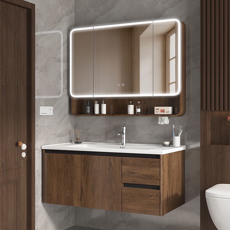 中古风胡桃木色蜂窝铝陶瓷一体盆浴室柜组合抽屉洗漱台批发