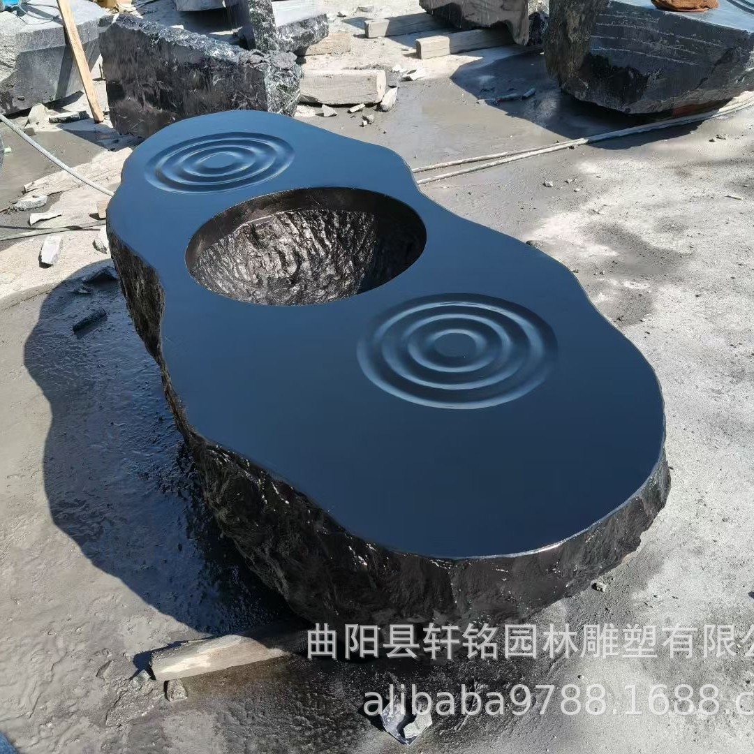 黑山石水钵定制中式园林景观石户外庭院造景黑色切片加工源头厂家