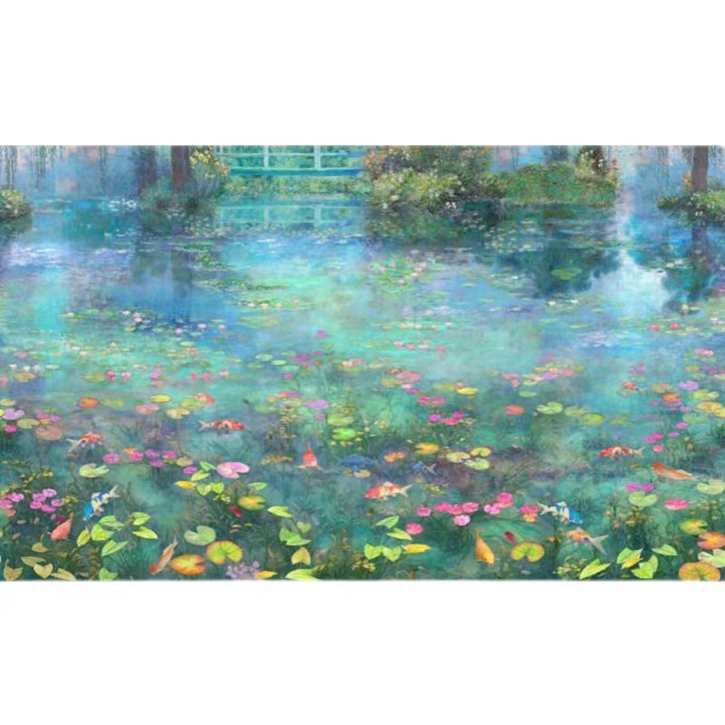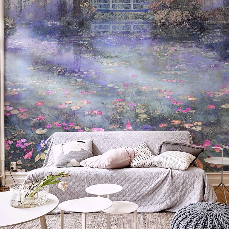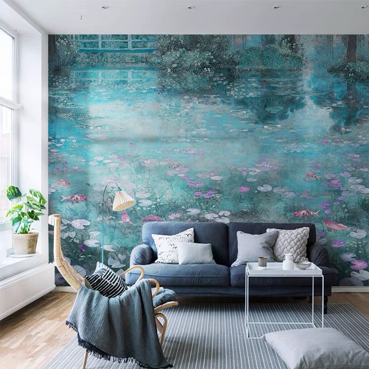 北欧手绘油画田园壁纸莫奈睡莲风景壁画客厅电视背景墙纸无缝墙布