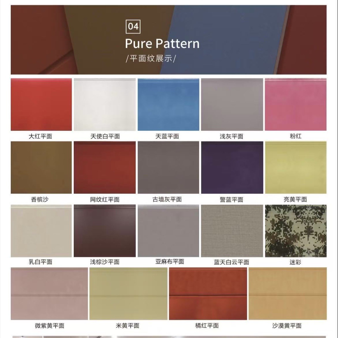 标砖纹系列,粗砖纹系列,大理石纹系列,弹涂纹系列,平面纹系列,木纹系列,瓦楞纹系列,长城板系列,彩石纹系列