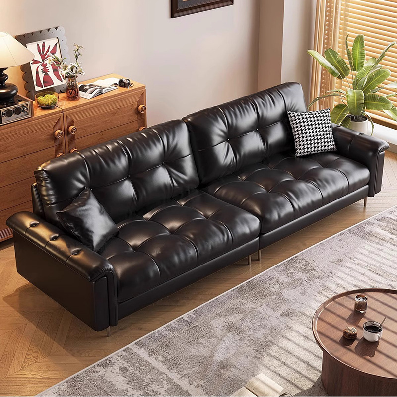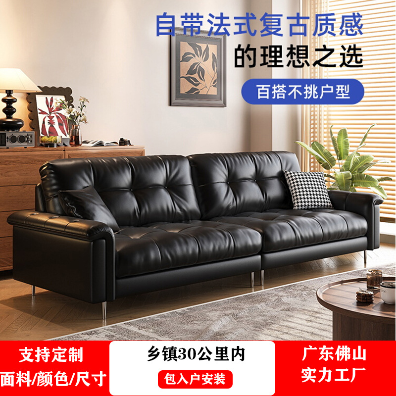 黑色意式极简真皮沙发客厅小户型法式复古直排美式中古星云沙发